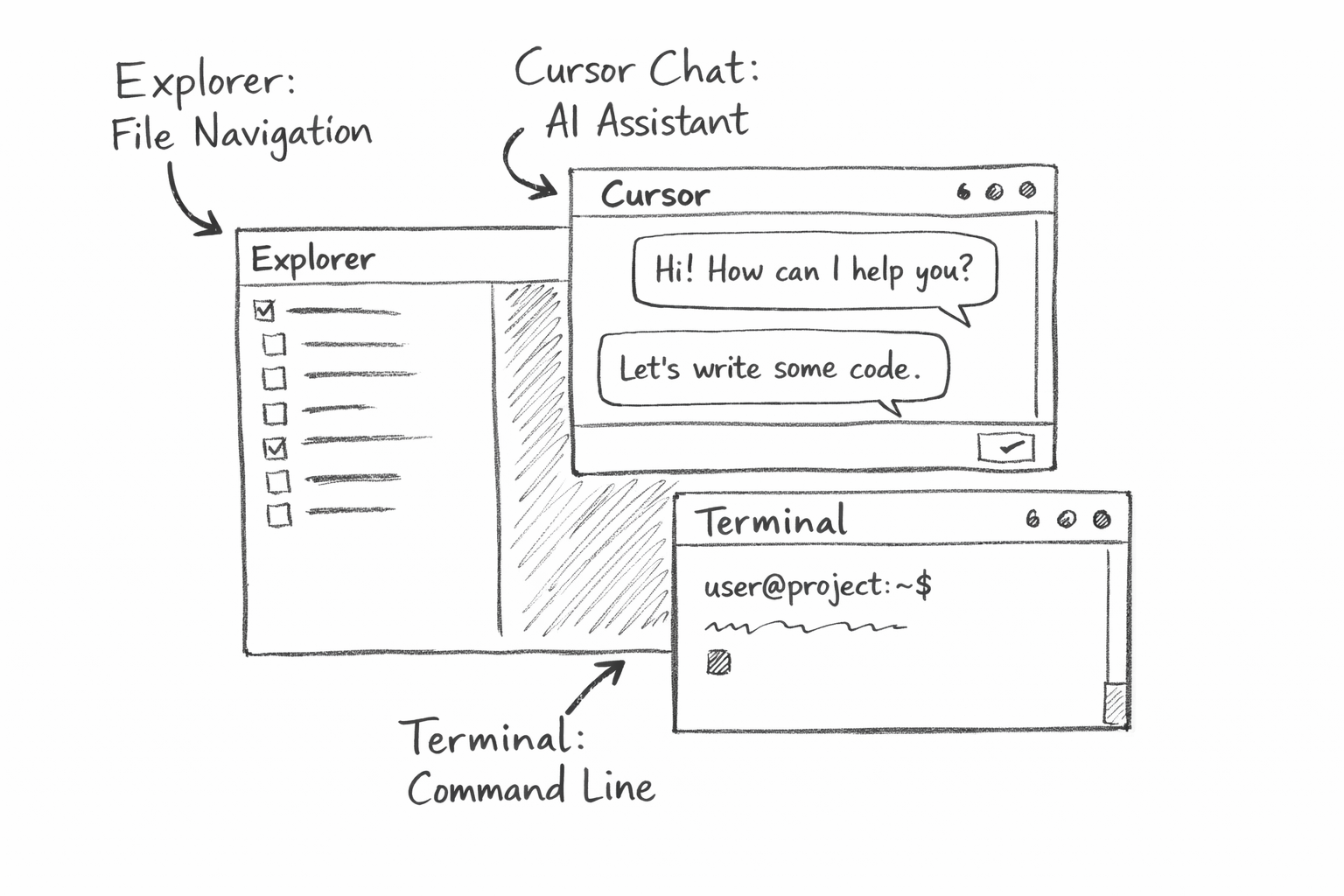 This is where Cursor is strong. The chat assistant is embedded directly in the UI, which makes everything feel askable. Stuck on a terminal command? Ask Claude. Unsure what a file does? Ask Claude. The boundary between the tool and the conversation mostly disappears.